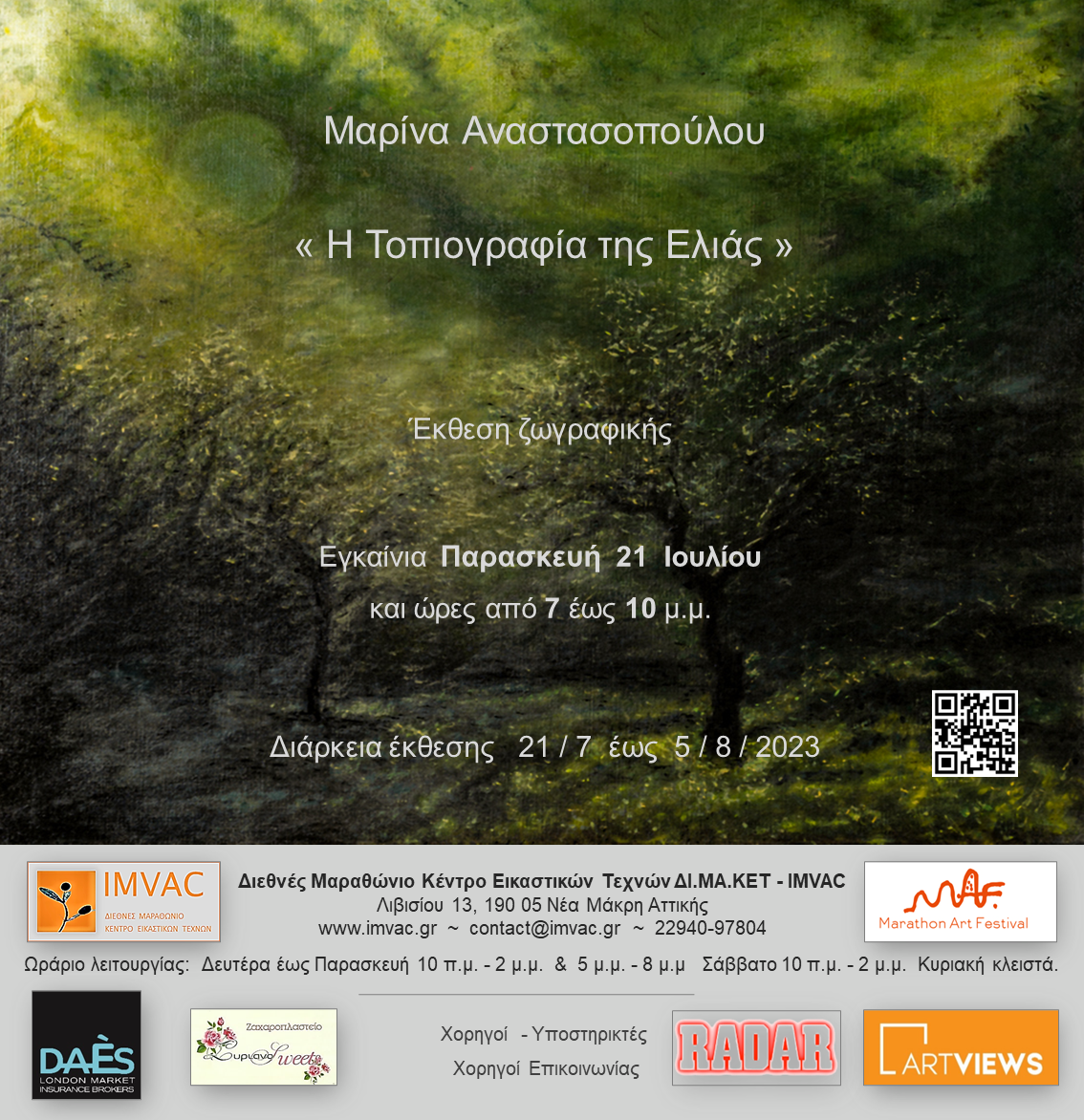 Στα πλαίσια προβολής και ανάδειξης νέων αξιόλογων καλλιτεχνών που έχει θέσει το Διεθνές Μαραθώνιο Κέντρο Εικαστικών Τεχνών, παρουσιάζουμε την Μαρίνα Αναστασοπούλου που εκθέτει μια σειρά "τοπιογραφιών" της με θέμα κυρίως την Ελιά. Με εξαιρετικό σχέδιο και εμπνευσμένη χρωματική διαχείριση, η ζωγράφος μας δίνει έργα που διακρίνονται για την πηγαιότητα και την ευαισθησία τους.,