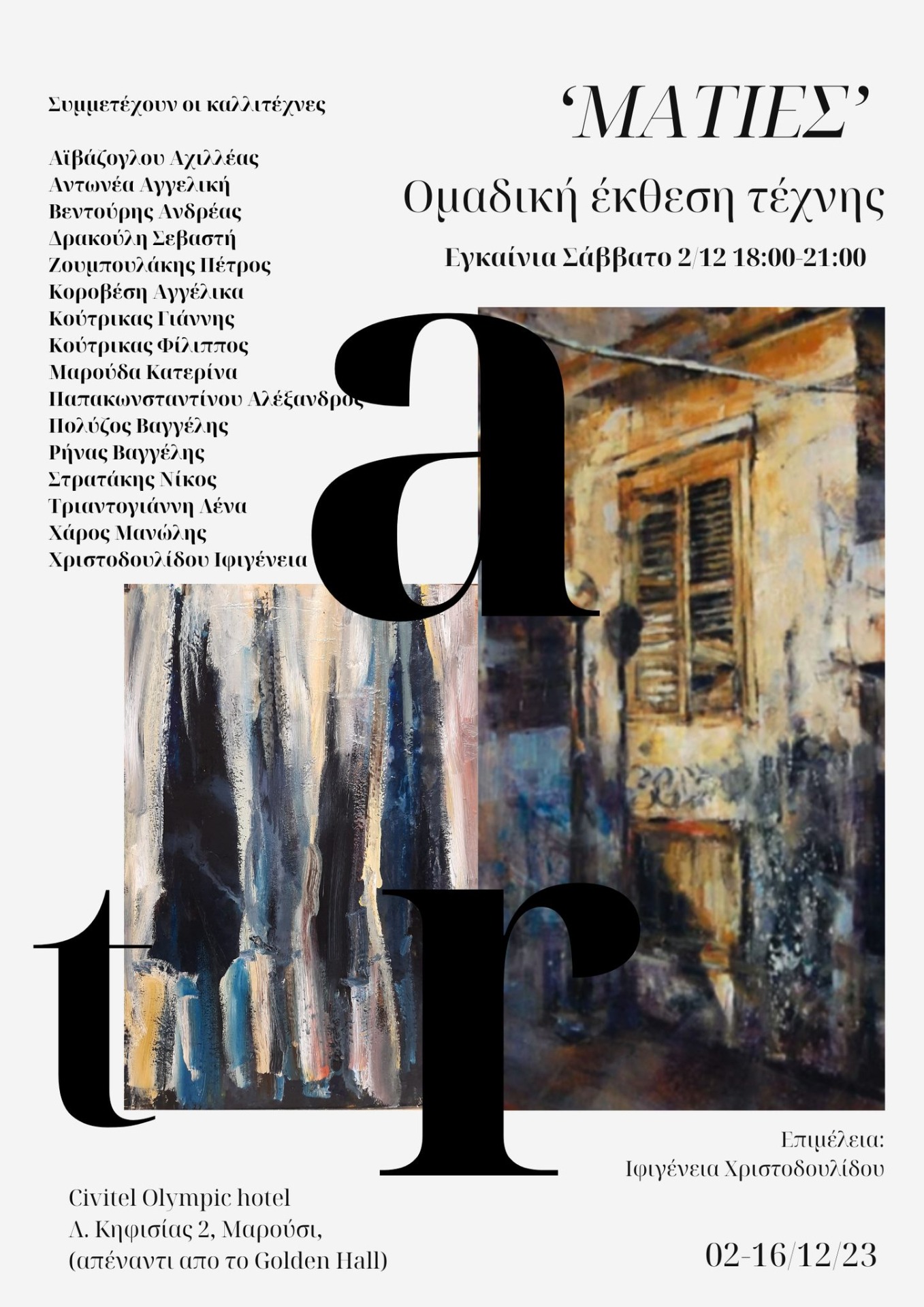 Η έκθεση τέχνης «Ματιές» επιχειρεί να αναδείξει την ξεχωριστή προσωπικότητα και ιδιοσυγκρασία του κάθε καλλιτέχνη, όπως εκφράζεται μέσα από το έργο που έχει επιλέξει να παρουσιάσει, τη διαφορετικότητα του τρόπου έκφρασης του και τελικά –και ουσιαστικά- τη 'ματιά' του καθενός στην τέχνη που υπηρετεί.